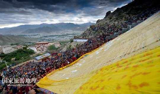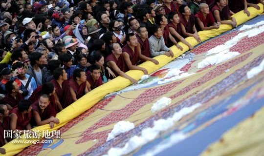 國家旅游地理 西藏拉薩8月6日訊 8月6日,拉薩哲蚌寺舉行展佛儀式。當(dāng)日,以西藏最大的格魯派寺廟哲蚌寺展佛為開端的雪頓節(jié)在拉薩拉開序幕。每年藏歷六月底七月初是西藏傳統(tǒng)的節(jié)日“雪頓節(jié)”。在藏語中,“雪”是酸奶子的意思,“頓”是“吃”“宴”的意思,“雪頓節(jié)”按藏語解釋就是吃酸奶子的節(jié)日,因此又叫“酸奶節(jié)”。因為“雪頓節(jié)”期間有隆重?zé)崃业牟貞蜓莩龊鸵?guī)模盛大的曬佛儀式,所以有人也稱之為“藏戲節(jié)”“曬佛節(jié)”。 /新華社記者 普布扎西攝