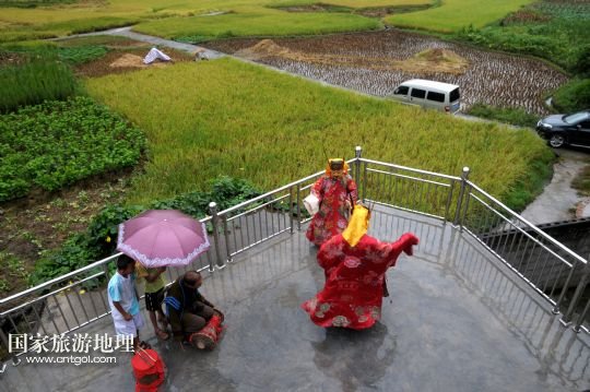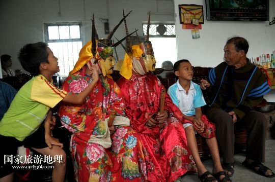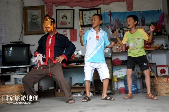 國家旅游地理 廣西河池8月19日訊 8月18日,譚圣慈老人(左一)帶著前來學(xué)習(xí)的兩名男孩跳儺面舞。在廣西北部與貴州交界一帶的我國唯一的毛南族自治縣——環(huán)江毛南族自治縣,神秘的儺戲被譽(yù)為毛南族的“族寶”。原始古樸、風(fēng)格獨(dú)特的儺戲是毛南族的民間傳統(tǒng)舞蹈,藝人在表演過程中經(jīng)常戴著被稱為儺面的木制面具。儺面一般高30厘米、寬20厘米,由毛南族藝人在民族口頭文學(xué)的基礎(chǔ)上依據(jù)個人想象創(chuàng)作,用優(yōu)質(zhì)木塊雕琢而成,共有文、武、善、兇四大類72種面相。