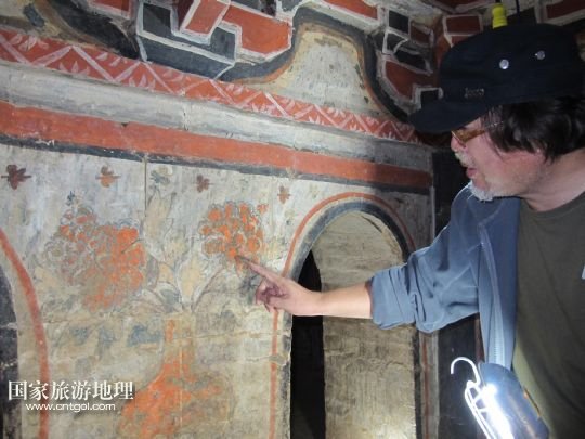 國家旅游地理 陜西延安9月15日訊 9月14日,考古學(xué)家正在查看畫像磚墓內(nèi)的壁畫。經(jīng)過近三個月的緊張工作,陜西省考古學(xué)家日前在陜西延安配合基建時,首次對一座宋金時期大型畫像磚墓進行了科學(xué)考古發(fā)掘。發(fā)現(xiàn)這座畫像磚墓竟是仿木磚結(jié)構(gòu)多室墓,對了解和研究陜北畫像磚墓形制、建筑結(jié)構(gòu)及其分布與內(nèi)容等,具有重要的標尺性意義。 /新華社記者馮國攝