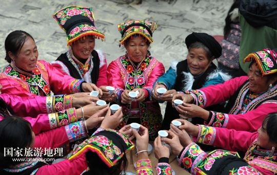 國家旅游地理 四川阿壩11月2日訊 11月2日,身著節(jié)日盛裝的四川省阿壩州汶川縣龍溪鄉(xiāng)村民們舉杯迎接羌歷新年的到來。當日,四川省阿壩州汶川縣龍溪鄉(xiāng)舉行傳統(tǒng)儀式迎接即將到來的羌歷新年。今年的11月3日農(nóng)歷十月初一是羌歷新年,這是羌族一年中最為隆重的“慶豐收、送祝福、祈平安”的節(jié)日,按民間習俗,過羌年時要還愿敬神,全寨人歡聚一堂,吃團圓飯,共慶佳節(jié)。 /新華社發(fā)(何海洋 攝)