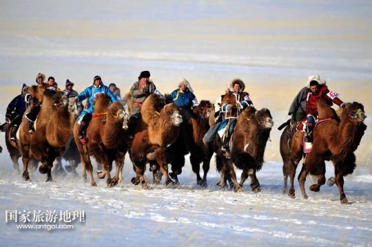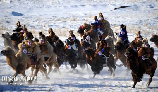 國(guó)家旅游地理 內(nèi)蒙古錫林郭勒1月5日訊 1月5日,牧民們?cè)?0公里駱駝速度賽比賽中。當(dāng)日,內(nèi)蒙古烏珠穆沁駱駝文化節(jié)在西烏珠穆沁旗烏蘭哈拉嘎蘇木舉行。來自呼倫貝爾、鄂爾多斯以及蘇尼特和烏珠穆沁草原的牧民帶著200多峰駱駝在白雪皚皚的草原上進(jìn)行駱駝選美、10公里駱駝速度賽等以比賽活動(dòng)和民俗風(fēng)情表演,展示內(nèi)蒙古草原上獨(dú)特的駱駝文化。 /新華社記者 任軍川 攝