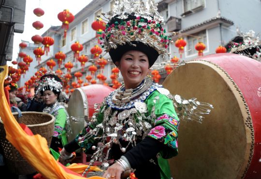 國家旅游地理 湖南湘西2月15日訊 2月14日,湖南鳳凰苗族婦女打起苗鼓。當(dāng)日是農(nóng)歷元宵節(jié),在湖南鳳凰古鎮(zhèn),當(dāng)?shù)鼐用衽c游客歡聚一堂,共同參與各種民俗文化表演活動,慶祝節(jié)日。 /新華社記者 范軍威 攝
