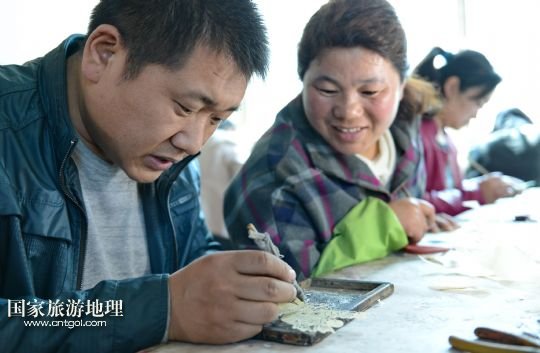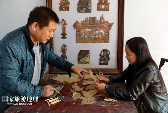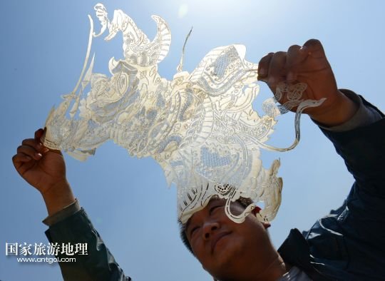 國家旅游地理 河北唐山4月2日訊 郭寶在檢查一件皮影藝術(shù)品的雕刻質(zhì)量(3月30日攝)。河北省遷安市趙店子鎮(zhèn)馬古寺村村民郭寶自幼喜歡皮影雕刻,師承當?shù)氐窨趟嚾送跽淅舷壬?,他雕刻的影人造型古樸、工藝精細,深受皮影收藏愛好者的歡迎。2003年,郭寶成立了“郭寶皮影傳承工作室”,并從村里招來20多位喜歡皮影藝術(shù)的農(nóng)民專門從事皮影雕刻。經(jīng)過幾年的發(fā)展,如今郭寶皮影工作室開發(fā)設(shè)計皮影工藝品3000余種,在傳承保護唐山皮影的同時還獲得了豐厚的收入。 /新華社記者楊世堯攝