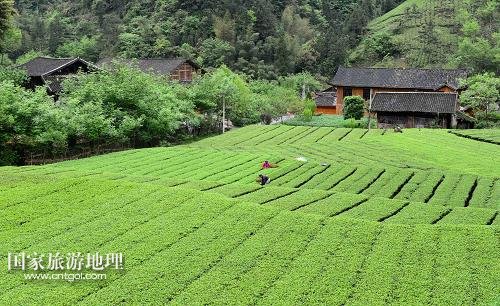 4月27日,兩位老人在村里茶園中采茶。