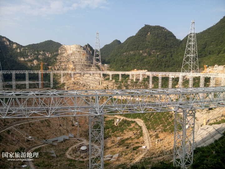 這是黔南平塘縣正在建設(shè)的大射電望遠(yuǎn)鏡,也稱 FAST,預(yù)計(jì)將于明年九月建成。FAST具有中國獨(dú)立自主知識(shí)產(chǎn)權(quán),是世界上正在建造及計(jì)劃中的口徑最大、最具威力的單天線射電望遠(yuǎn)鏡,其設(shè)計(jì)綜合體現(xiàn)了我國高技術(shù)創(chuàng)新能力。500米口徑球面射電望遠(yuǎn)鏡是利用貴州喀斯特地區(qū)的洼坑作為望遠(yuǎn)鏡臺(tái)址,建造世界第一大單口徑射電望遠(yuǎn)鏡,其擁有30個(gè)標(biāo)準(zhǔn)足球場(chǎng)大的接收面積。FAST作為世界最大的單口徑望遠(yuǎn)鏡,將在未來20至30年保持世界一流地位。