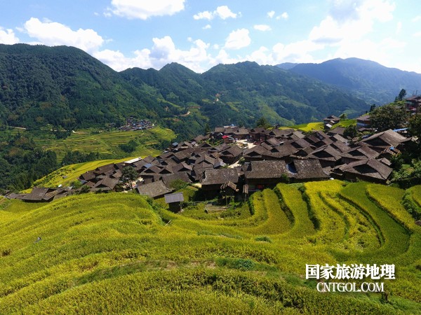 9月5日,貴州省黔東南苗族侗族自治州從江縣加榜鄉(xiāng)黨扭村和加車村近萬(wàn)畝水稻開鐮收割。圖為:鑲嵌在田園中的苗家吊腳樓。
