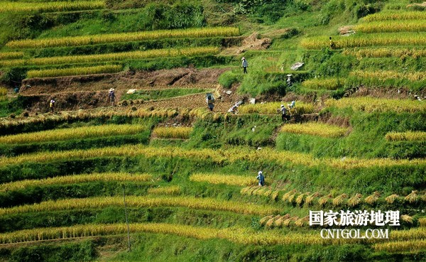 9月5日,貴州省黔東南苗族侗族自治州從江縣加榜鄉(xiāng)黨扭村和加車村近萬(wàn)畝水稻開鐮收割。圖為:腰帶梯田上的繁忙。